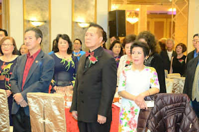 H.2- Nghi lễ chào cờ và hát quốc ca VNCH - Chào cờ và hát quốc ca Hoa Kỳ - Phút mặc niệm - Ba emcees của chương trình: từ bên trái HT Danh dự/ VBQG Phòng Tít Chắng, HT Danh dự Sỳ Hồng Kóng, MC Hoa ngữ, Hội trưởng Danh dự/ VBQG Tsú A Cầu.